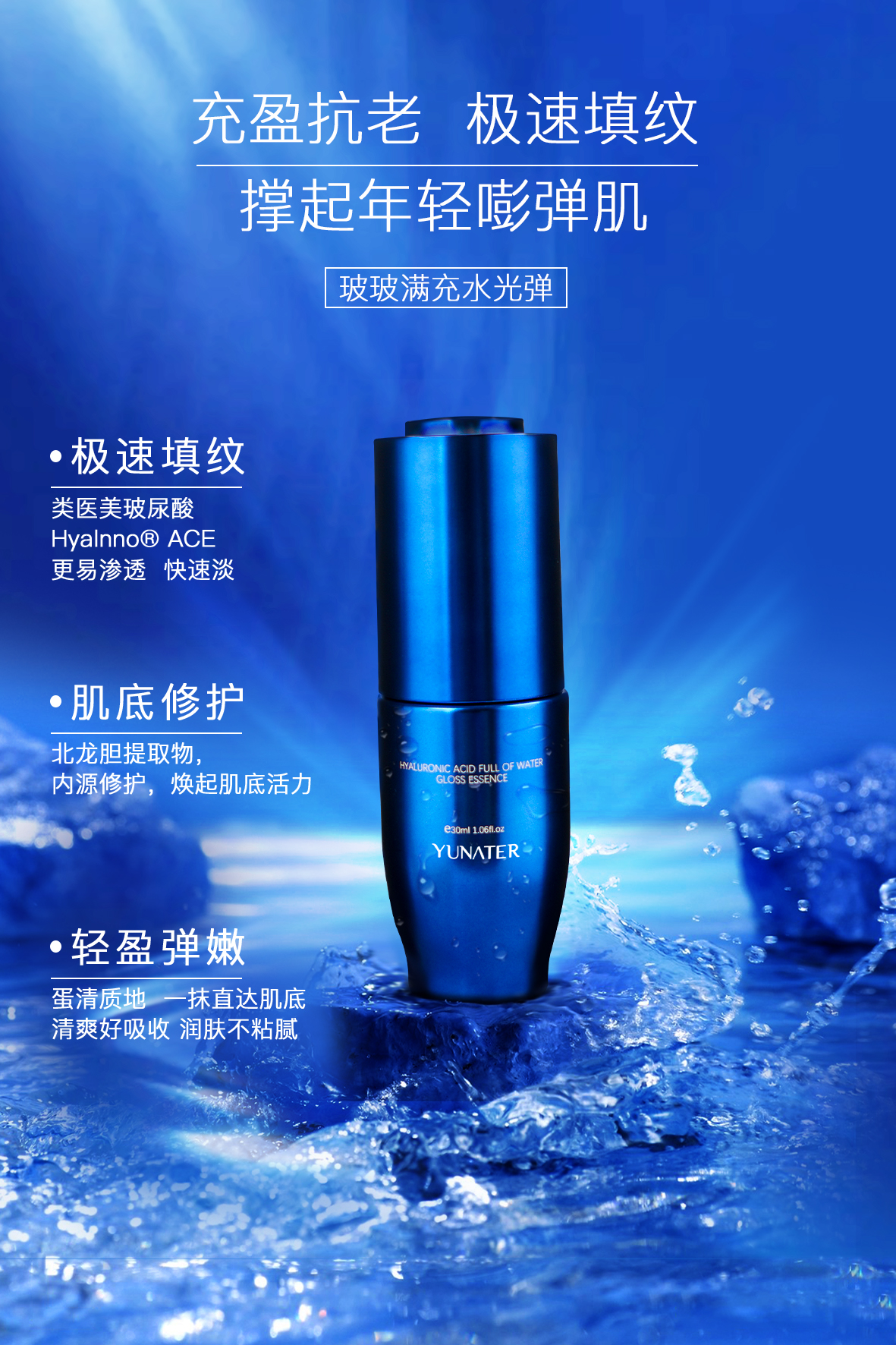 高质量玻尿酸,超速充盈。蛋清质地,水润轻盈,滴滴深入,一抹直达肌底,清爽好吸收,润肤不粘腻