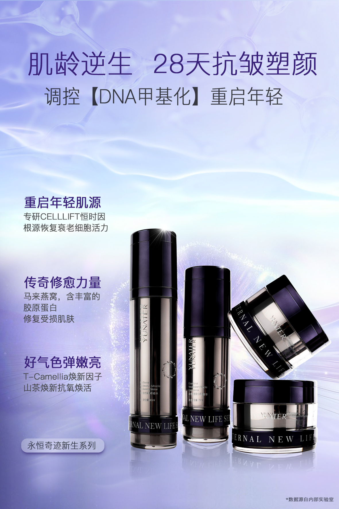 针对熟龄肌抗老,抚纹·丰盈·速焕亮·紧脸廓,重启年轻,重燃细胞新生潜能, 一套驻龄弥新。