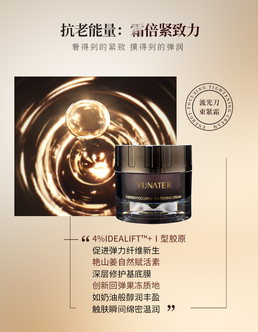 专研塑紧 轮廓上扬 拉起年轻「紧」戒线 ,创新果冻回弹质地,深层修护,瞬间充能,如奶油般醇润丰盈,触肤瞬间 绵密温润,细密包裹每寸肌肤