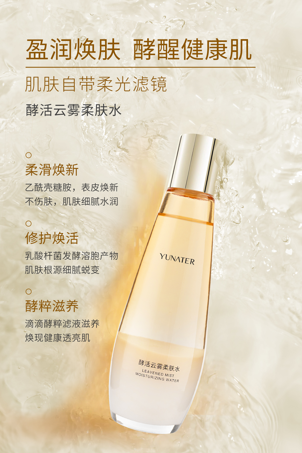 云雾光感,焕活弥新,云晶光感透亮技术,「雾态级」焕新,弱化暗沉与粗糙,轻拍酵活健康透亮肌,让肌肤呈现自然透亮的光泽感。