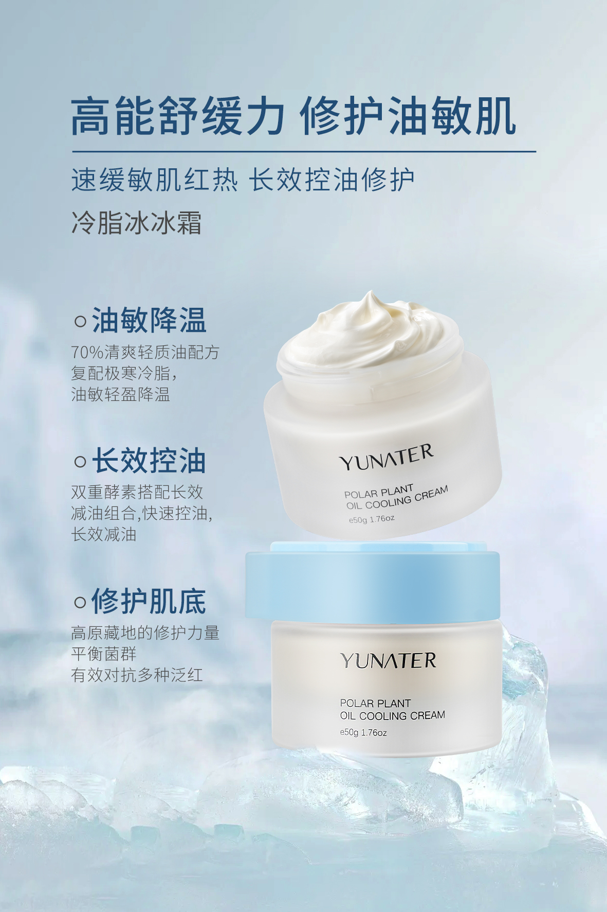 极地冷脂,专研油皮肤感,独特奶糕质地激活皮肤冷感受体,快速降温